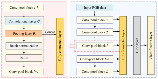 In a traditional CNN architecture, the feature maps of shallow layers are neglected, and the confidential information of the raw input with different depths is lost. To increase the amount of information input to the fully connected layer, the feature maps from all the pooling layers are directly concatenated to the fully connected layer to achieve different tasks, as shown in Figure 2.