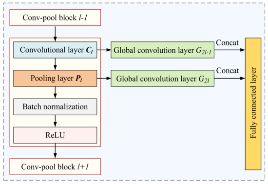 To reduce parameter size without reducing the amount of input information, the feature maps from all the convolutional and pooling layers are merged into a feature sequence through the corresponding global convolution layers before being concatenated to the fully connected layer to achieve different tasks, as shown in Figure 3.