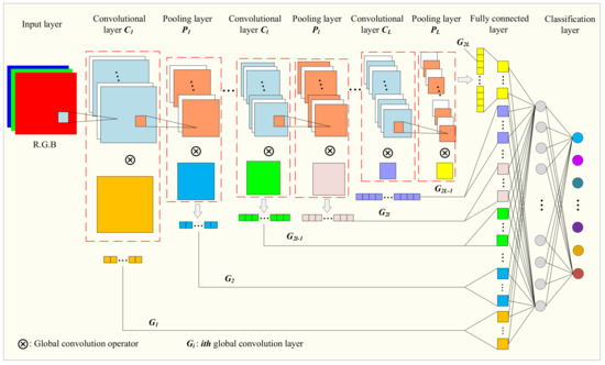 where is the kth feature map of lth convolutional layer, is the global convolution kernel with the same dimension as , is the kth feature map of lth pooling layer, is the global convolution kernel with the same dimension as , is the weight vector and is the bias value of the neuron, M is the number of neurons, and L is the number of conv–pool blocks.