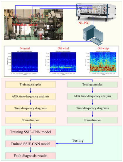 The time–frequency representations of the rotor–journal bearing system can reflect its fault information well, and the fault diagnosis can be achieved by inputting the AOK time–frequency images into the SGIF-CNN model. As shown in Figure 5, the proposed method’s modeling procedure follows data acquisition, time–frequency representation extraction, and deep learning model training and testing.