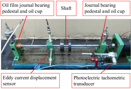 As shown in Figure 6, the test rig consists of a motor, a rigid cylindrical shaft with two disks, and two hydrodynamic journal bearings. The rigid shaft has two parts: a short part with a diameter of 24 mm and a length of 40 mm is supported by the left oil film journal bearing, and the right journal bearing supports the long part with a diameter of 12 mm and a length of 480 mm. Two disks are placed on the shaft close to the middle plane between the two journal bearings. Two proximity sensors (OD-Y911801 by OuDuo Inc) were mounted on the center disk’s right side to collect the rotor’s horizontal and vertical vibration data at that position. A small mass was attached to each rotating disc to simulate an unbalanced mass in the experiment.