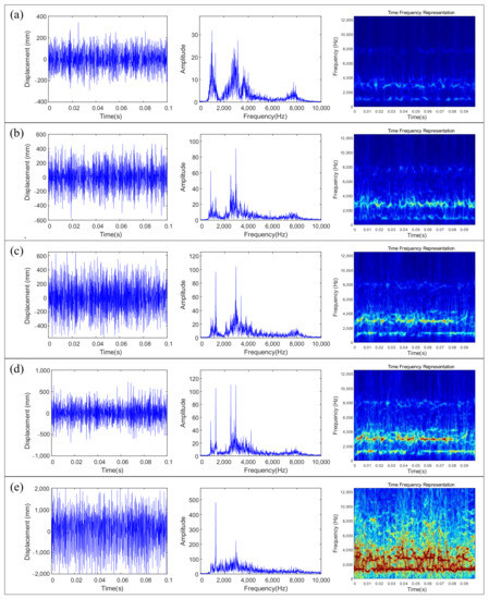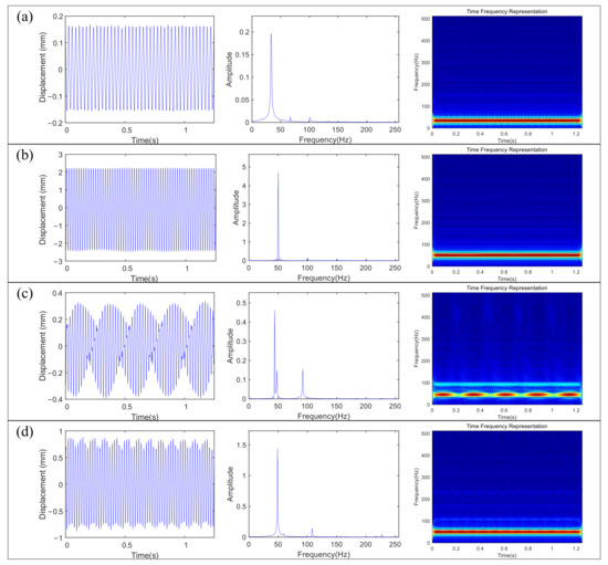 Figure 7 shows the waveform, spectra and AOK time-frequency distribution of the normal state, first-order resonance state, oil whirl state and oil whip state. The vibration responses of the rotor–journal bearings system in the normal state, first-order resonance state, and oil whip state are relatively similar in that only one major frequency component can be found in both the spectra and the time–frequency distributions. When the rotor system is operating in the oil whirl state, the waveform of the vibration signal fluctuates greatly, and there are two major frequency components—fundamental frequency and the oil whirl “half” frequency component—in both the spectrum and the time–frequency distribution.