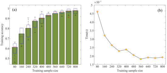 The effect of training sample size on (a) training accuracy; (b) time to process one sample.