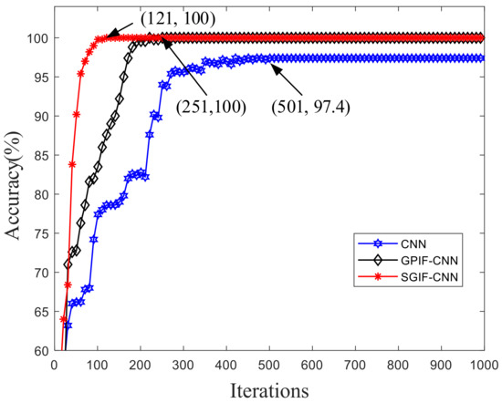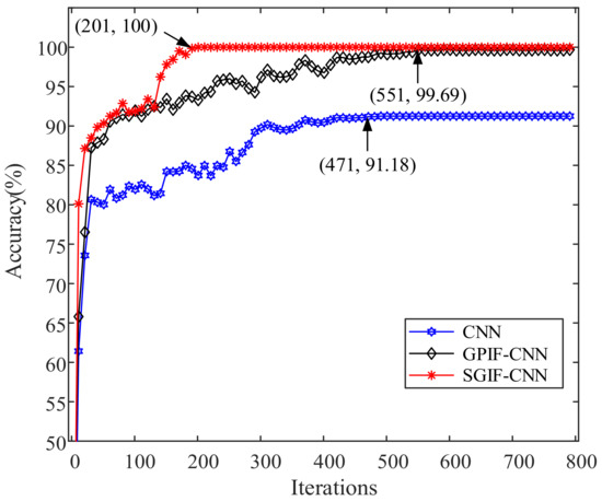 The traditional CNN’s training accuracy converged after 471 iterations with an accuracy of 91.18%. Compared with the traditional CNN, the training accuracy of GPIF-CNN is greatly improved due to the fusion of information from the shallow pooling layers, reaching 99.69% after 551 iterations. Due to the fusion of shallow convolutional and pooling information and a smaller parameter size in the fully connected layer, the training accuracy of SGIF-CNN reached 100% after 201 iterations, which is faster than the convergence rate of the traditional CNN and GPIF-CNN.