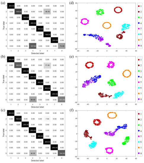 To further identify the detailed classification results of the testing phase, the confusion matrix diagrams of the testing results of these three CNN models are listed in Figure 10, where the vertical axis is the actual sample label while the horizontal axis is the predicted label of the sample. The confusion matrix gives both the classification and misclassification information, and the confusion matrix’s main diagonal represents the classification result for each fault pattern. As shown in Figure 10a, the traditional CNN misclassifies the testing samples of fault pattern 2 and fault pattern 8 as fault pattern 6 and fault pattern 4, respectively, in which 127 samples out of 200 of fault pattern 8 are mislabeled as fault pattern 4. Similar to the traditional CNN, the GPIF-CNN and SGIF-CNN incorrectly diagnose samples of fault pattern 2 as fault pattern 6 and identify the samples of fault pattern 8 as fault pattern 4, with a lower number mislabeled, as shown in Figure 10b,c. To further compare the performance of these three CNN models, the t-distributed stochastic neighbor embedding [38] (t-SNE) technique is applied to analyze the extracted deep features in the hidden classifier layer of these three CNN models. The two-dimensional scatter plot distributions of the testing results of these three CNN models are shown in Figure 10d–f, in which the scatters of fault pattern 8 and pattern 4 are very close together and partially mixed. Compared to the traditional CNN and GPIF-CNN, the scatter distributions of fault pattern 8 and pattern 4 of the SGIF-CNN testing results are farther apart with a smaller mixed part, indicating that the SGIF-CNN can effectively identify the fault categories of the rotor–journal bearing system.