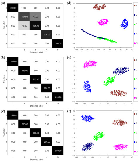 The confusion matrix of (a) traditional CNN, (b) GPIF-CNN, and (c) SGIF-CNN and 2D visualization of the learned features of (d) traditional CNN, (e) GPIF-CNN, and (f) SGIF-CNN.