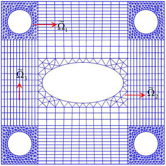 A square thin plate with a hole is shown in Figure 1 below. Four circles with radius R and around the ellipse are wrapped by small rectangles. Four square areas wrapped by small circles are denoted by , one small rectangle wrapped by an ellipse is denoted by , and the other areas are denoted by . The CST element is used for discretization on , the LST element is used for discretization on , and the Q4 element is used for discretization on . Three different types of mesh are common nodes on the junction line of the boundary to ensure that the calculated data can be transmitted to each other.