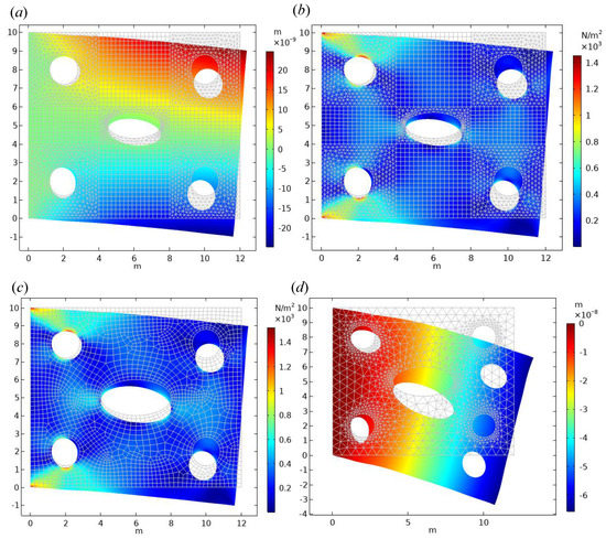 Numerical results of hybrid finite−element 2D thin−plate deformation. (a) Numerical solution of the hybrid finite-element displacement component U. (b) Numerical solution of Von Mises stress. (c) Von Mises solution of Q4 element adaptive FEM contour diagram of the numerical solution of stress. (d) Schematic diagram of the displacement component V of the CST element adaptive FEM solution.