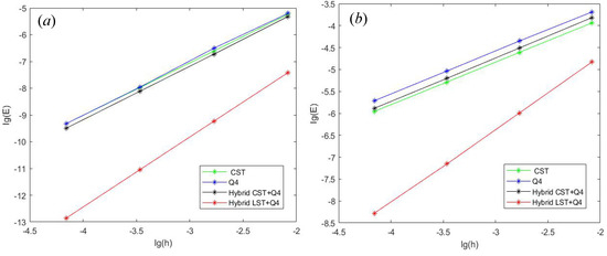 When the number of mixed elements is = 4010 (3092 triangular elements and 918 quadrilaterals), the total number of triangular CST elements is 5012, and the total number of Q4 elements is 4811, the calculation time of = 4 s triangular element is = 4.45 s, and the calculation time of Q4 element is = 4.23 s. However, in terms of convergence rate, the numerical convergence order of displacement is close to order 2. The convergence order of mixed-element displacement using LST + Q4 is about 2.61, and the stress solved by adaptive FEM is about linear convergence. However, the stress convergence order of mixed-element LST + Q4 is close to 1.67. From Figure 4a,b, it can be seen that the convergence speed of the LST + Q4 hybrid element is the fastest. Therefore, when the hybrid element selects the appropriate basis function and good grid combination, the numerical method has the characteristics of short calculation time and fast convergence speed, which also reflects the effectiveness of the method.