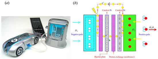 Hydrogen starts from the anode plate (anode) of the hydrogen fuel cell, and through the catalyst (platinum) in the polymer electrolytic membrane, two electrons in the hydrogen molecule are separated. The hydrogen ions (protons) that lose electrons pass through the proton exchange membrane (the role is to separate hydrogen ions and electrons) and reach the cathode plate (cathode) of the hydrogen fuel cell. However, electrons cannot pass through the proton exchange membrane, and electrons pass through the external circuit to reach the cathode plate of the hydrogen fuel cell, thus generating current in the circuit. After electrons reach the cathode plate, they are recombined with hydrogen ions and oxygen atoms in the air to form water. Because of the oxygen supplied to the cathode plate [40,41], these can be obtained from the air. Therefore, as long as hydrogen is continuously supplied to the anode plate, air is supplied to the cathode plate, water (steam) is taken away in time, and electricity can be continuously provided. Figure 1 presents the application and internal power generation process of the hydrogen fuel cell. The internal structure of the fuel cell is generally composed of five parts, namely, a bipolar plate (metal, graphite, polymer, etc.), an electrode, a catalyst, a proton exchange membrane and an electrolyte solution. The fuel cell hydrogen supply process and internal power generation diagram for new energy vehicles is depicted in Figure 5a, which provides a schematic diagram for adding liquid hydrogen to the new energy vehicle powered by a hydrogen fuel cell. Due to the high cost of production and the difficulty of safety control technology, the current hydrogen fuel cell has not been mass-produced and market-oriented to popularize it to users. In (b), the internal structure and power generation process of a hydrogen fuel cell is depicted, which makes it easier to understand the working principle of hydrogen fuel cells.