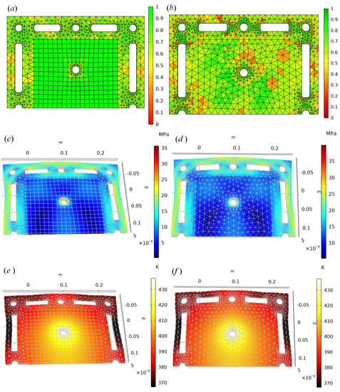 The hybrid finite thermo-mechanical coupling model established in this paper was used to solve the bipolar plate, which is mainly to solve the three-dimensional steady-state heat conduction equation and the three-dimensional static linear elastic equation. The surrounding of the bipolar plate was the channel of the fuel gas, and the center was the aluminum heated circular plate. The solution region of hydrogen fuel cell bipolar plate is a multi-connected rectangular region. Figure 6 is the numerical solution of the hybrid element of the fuel cell. Figure 6a,b are mainly the comparison results of the two types of mesh quality. (a) The number of hexahedral elements was 258, the number of tetrahedral elements was 534 and the number of mesh vertices was 2030. The average mesh quality was 0.82. (b) There were 1794 tetrahedral elements, and there were 2919 mesh vertices at the mesh vertices. The average mesh quality was 0.68. The comparison of the two images shows that the mesh quality of the mixed element was higher, and the common feature was that the mesh quality at the edge of the bipolar plate was relatively poor.