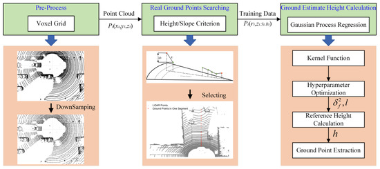 Commonly used ground segmentation algorithms are divided into two methods: surface-based methods and line-based methods. The surface-based method considers the shape of the ground, regarding it as a plane or a curved surface. In this method, a certain number of ground candidate points are selected to complete the fitting of the plane or curved surface. Depending on whether the ground is regarded as the plane or curved surface, the fitting algorithm used is different. When the ground is regarded as a plane, the random sampling consistency (RANSAC) algorithm and its improved algorithms are mainly adopted [14,15,16,17,18]. Qiu et al. proposed an iterative fitting method of datum surface based on prior distribution information; this strategy can avoid the concentration of initial frame sampling points in a small range, and effectively improve the efficiency of sampling iteration [15]. Li et al. also chose to optimize the sampling point selection process. They introduced the normal distribution transformation (NDT) to convert a certain number of points into NDT cells, and then divided these into planar cells and non-planar cells. In the subsequent sampling process, only those belonging to planar cells were selected to fit [16]. Obviously, the biggest defect of this type of algorithm is that the fitting accuracy is too poor for the ground with changes. Therefore, it is more reasonable to treat the ground as a surface, and then select enough points to fit the surface. B. Douillard et al. used the Gaussian process incremental sample consensus (GP-INSAC) algorithm to complete the curved surface fitting, which first uses the INSAC algorithm to complete the selection of the initial ground candidate points, and then uses the Gaussian process to complete the ground parameter estimation [17]. In this way, fitting the entire ground plane poses a large computational burden. Therefore, the line-based methods are proposed.