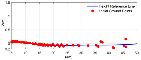 1. Determine the first datum point in current segment, which is the yellow point in Figure 3. The first datum point needs to meet the height lower than the threshold . The is the limit ground value calculated from the LiDAR installation height and the ground limit slope under urban working conditions. When the point is higher than the , it cannot be the ground point. The bin where the first datum point located is .