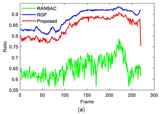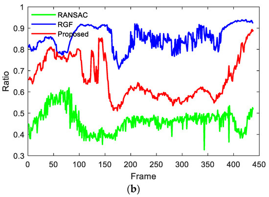 In the verification experiment based on the KITTI dataset, four datasets were selected for processing, which total more than 1000 frames of point cloud data. The most used RANSAC algorithm and the Ray Ground Filter (RGF) algorithm proposed in [19] were used as comparison. In this paper, we evaluate the performance of ground segmentation using the ability resist over-segmentation and under-segmentation. Currently, there is no labeled open-source dataset which is used to evaluate the ground segmentation effect; many papers rely on visual effects to compare the effects of algorithms [15,22]. Therefore, the ground segmentation effect in this paper will be reflected by the ratio of ground points to all points in a frame of data. Figure 6 show the ratio of ground points of 2011_09_26_drive_0018 and 2011_09_26_drive_0051 respectively, and their common feature is that they all have a certain slope. It can be clearly seen that due to the existence of slopes, the ratio of ground points in the RANSAC algorithm has always been very low, which indicates that the RANSAC algorithm has always been in a state of under-segmentation. The proportion of ground points of RGF and the proposed algorithm is higher than that of the RANSAC algorithm, but the ratio of ground points of the RGF algorithm is always higher than that of the proposed algorithm, so the results need to be further analyzed.