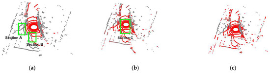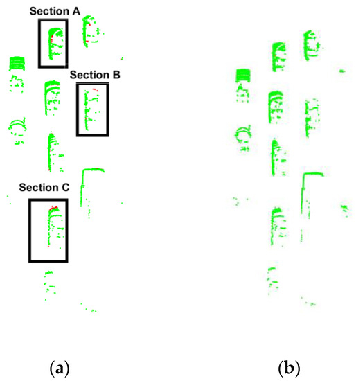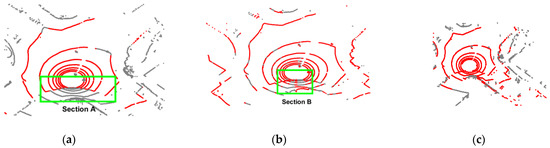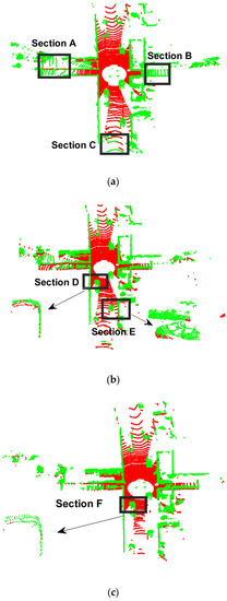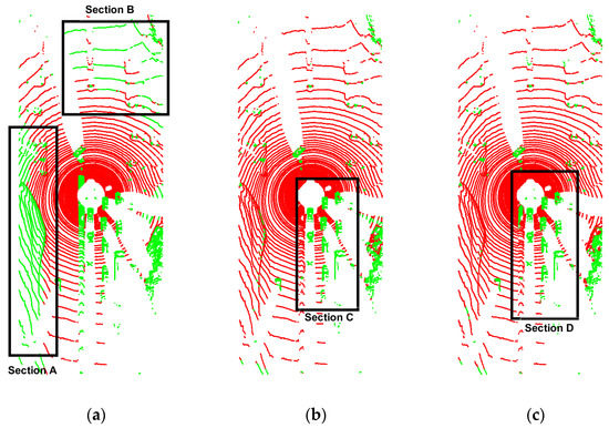 Figure 7 shows the segmentation results for one of the frames in dataset 2011_09_26_drive_0018, the ground points are shown in red, and the non-ground points are shown in green. It can be seen from Figure 7a that the RANSAC algorithm does not have the ability to describe the ground fluctuation, and obvious under-segmentation occurs at Section A and Section B. The more intuitive comparison between Section C and Section D in Figure 7 is shown in Figure 8, which shows the RGF has obvious over-segmentation where there are obstacles. Table 1 shows that the proportion of ground points after the frame is divided by three types of algorithms. It can also be seen that the RGF algorithm has over-segmented. The reason is the RGF algorithm must set a relatively loose slope threshold and height threshold to ensure enough acquisition, which inevitably leads to the insensitivity of the RGF algorithm to height. The proposed algorithm relies on the strong regression ability of the Gaussian process, and the slope threshold and height threshold can be set stricter. Therefore, the proposed algorithm can both describe the undulating ground to prevent under-segment and prevent over-segmentation.