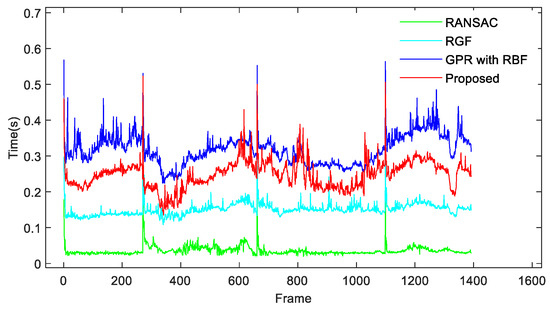 The time-consuming result comparison is shown in Figure 10. Since the RANSAC algorithm simply fits a random plane, it takes the shortest time, with an average time of 0.0358 s. In addition, the RGF algorithm takes into account certain ground fluctuations; the average time-consuming is 0.1511 s, which is slightly higher than the RANSAC algorithm. Compared with the RGF algorithm, the proposed algorithm has one more step, so it is reasonable that the time consumption is higher than that of the RBF algorithm. Meanwhile, the experimental conclusions of the literature [17] and literature [20] proved that the higher time consumption is acceptable and can achieve the real-time performance of autonomous driving. The average time consumption of the algorithm using the RBF function is 0.3483 s, while the average time consumption of the proposed algorithm is 0.2184 s, and the time consumption is reduced by 37.26%. This proved that the Gaussian process using sparse covariance runs more efficiently than Gaussian process using RBF kernel function, which means that compared with the traditional RBF kernel function, the introduced sparse covariance function can effectively reduce the time consumption.