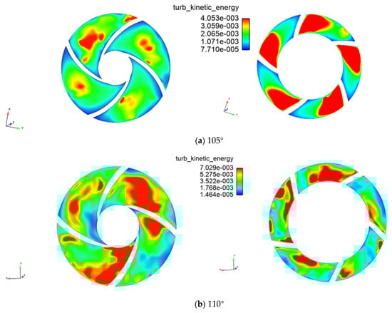 A study on the turbulent kinetic energy can better elucidate the turbulence characteristic of solid-liquid two-way flow in the impeller and guide vane. Figure 9 shows a schematic diagram of the turbulent kinetic energy of impeller guide vanes for different wrap angles.