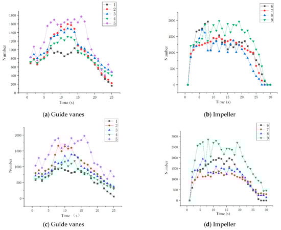 As time progresses, the number of particles in the deep-sea lifting test pump continues to increase. As the number of particles in the deep-sea lifting test pump gradually increases, the particles at the lower end are squeezed by the particles in the upper section, and it becomes easier to pass through the deep-sea lifting test pump. The particle depositions in the different guide vanes and impeller channels in the pump are also different. Figure 14 visualizes the changes in the number of particles in the guide vanes and impeller channels over time.