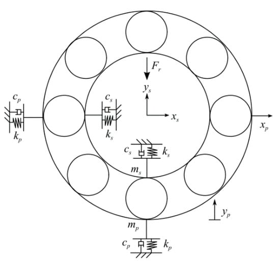 where xs and xp denote the displacement of the inner race and outer race in the x direction, ys and yp represent the displacement of two raceways in the y direction, accordingly. Fx and Fy are the elastic contact force between the raceways and the rolling elements in the x and y direction, and Fr is the radial load generally produced by the weight of the shaft and the rotor. Other parameters in Equation (1) can refer to the given nomenclature table.