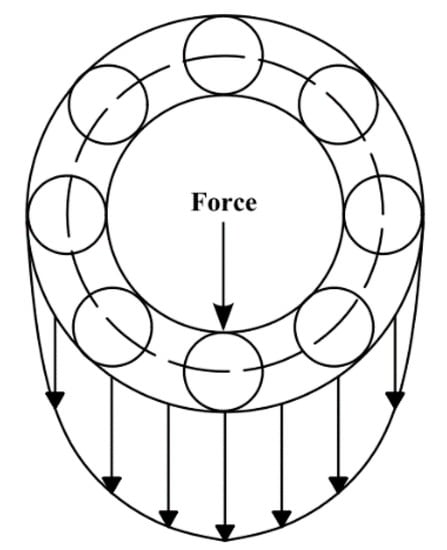 When the bearings operate, part of the raceway will be in the load zone, and the other part of the raceway will be in the non-load zone, which is shown in Figure 3. The contact deformation of each rolling element is determined by the angular position of the rolling element, the relative displacement between the inner and outer races, and the bearing clearance. The calculation of the contact deformation of the jth rolling element can be given as