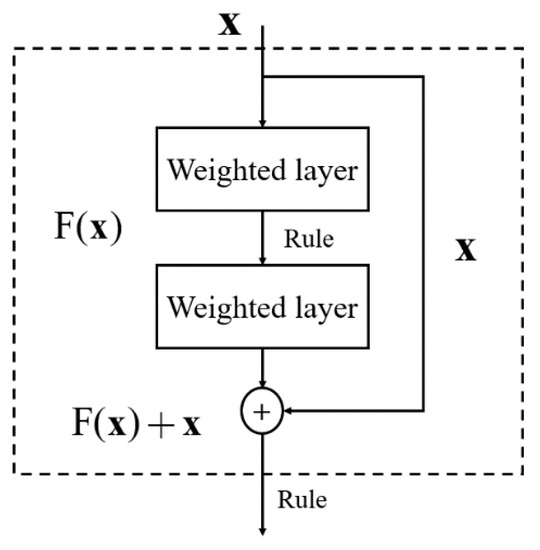 where Xl and Xl+1 denote the input and output vectors of the lth residual unit, which generally includes multi-layers. F is the residual function, which represents the learned residual, while h(Xl) = Xl denotes the identity mapping, and f(yl) is the activation function. Based on Equation (12), the learning features we obtained from the shallow layer l to the deep layer L are described as