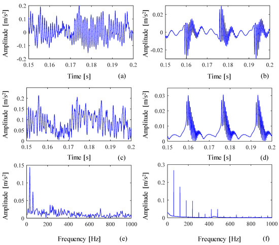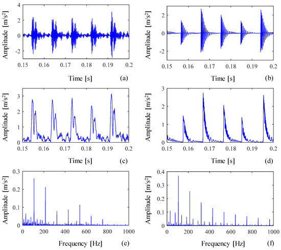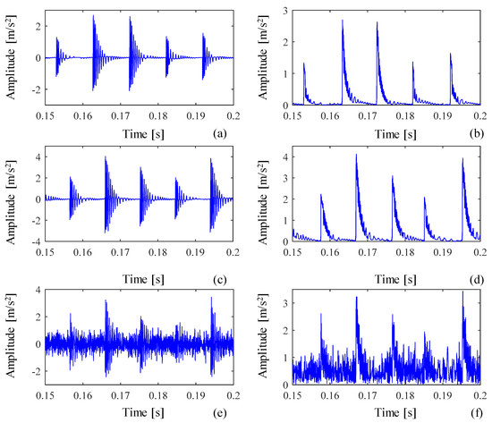 In parameter identification, a group of experiment data is required. After parameter identification, the dynamic model can generate data under different conditions. For example, parameter identification is carried out when the rotation speed is 1797 rpm with a 12 kg load. The model can generate vibration data at different speeds and different loads. Figure 7 shows the generated data with the outer race fault, where (a,c,e) are the original data at different speeds, different pre-loads, and with noise, and (b,d,f) are the envelop data at different speeds, different pre-loads, and with noise. Similarly, the vibration data in the normal case and the inner race fault case can also be generated. Figure 8 shows the simulated vibration data in the inner race fault case. Only a few data are required (such as data with the outer race fault), and the model can generate rich data in different situations.