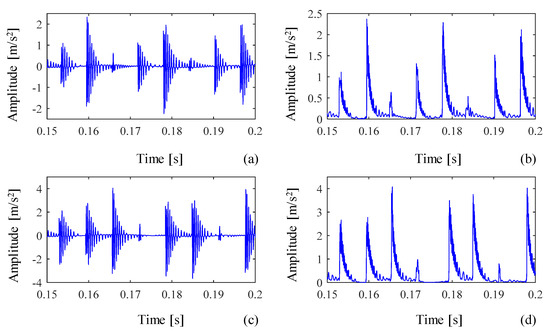 The generated data with inner race fault: (a,b) are the original data and the envelop data when the rotation speed is 1797 rpm; (c,d) are the original data and the envelop data when the rotation speed is 1730 rpm.