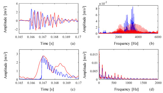 Comparison of experimental and simulation data: (a,c) are the data in the time domain; (b,d) are the data in the frequency domain, where the blue line is the experiment data, and the red line is the simulation data.