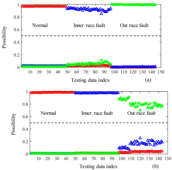 To overcome the limitations of demands of prior expertise based on the signal-based methods and achieve higher performance, machine learning techniques have already been widely applied in mechanical fault diagnoses [13]. Based on the machine learning techniques, fault diagnosis is regarded as a classification problem. In the traditional machine learning methods, representative features are first extracted from the raw signals, based on which pattern of recognition technology is applied to classify the health conditions of the equipment, for instance, support vector machines (SVM) [14], clustering algorithms [15] and artificial neural networks (ANN) [16,17] and so on. Shi et al. [18] applied linear discriminant analysis and gray wolf optimizer to improve the SVM algorithm and enhance the performance of fault classification. Zhang et al. [19] applied the BP neural network algorithm, which was based on the transfer component analysis, to detect the bearing fault states. In spite of the success achieved by these methods of fault diagnosis in the past years, it is still a challenge to ensure fault diagnosis accuracy with highly complex nonlinear signals. Due to the high performance in dealing with nonstationary signals, the deep learning method has recently been developed for feature extraction and pattern recognition [20]. Lei et al. [21] presented a framework for intelligent fault diagnosis, where a two-layer neural network with sparse filtering was constructed to learn the features from raw mechanical signals directly. Additionally, based on these learned features, the mechanical faults were identified by the classifier. Kolar et al. [22] propose a multi-channel deep convolutional neural network configuration for a rotary-machinery state classification. Janssens et al. [23] proposed a feature learning model for the bearings condition monitoring, based on convolutional neural networks, which removed the need for expert knowledge related to feature extraction compared with the classical statistical feature analysis. Mao et al. [24] proposed a multiple-fault diagnosis method that was based on deep output kernel learning, in which the depth features were extracted adaptively by an auto encoder neural network and thus, by means of solving the objective function constructed by the output kernel regularizer, the fault classifier was constructed. Due to the powerful capacity for classification and excellent convergence behaviors, deep learning methods can learn the deep features of different data and distinguish them automatically. However, deep learning methods require a large number of datasets to achieve a high accuracy of classification [25]. The industrial applications are limited by the requirement of in-service data under a wide range of operating conditions, which is generally an expensive and time-consuming practice to carry out dozens of experiments, especially for the key components in large machinery and equipment.