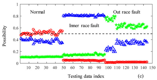 Figure 10 shows the distribution of the probability of each dataset after training. The training dataset contains 500 groups of data, while the testing dataset contains 150 groups of data. If the real data (the original data and the envelop data) are used for training, the classified accuracy can reach 100%. The reason for this is that the difference is great for the signal in the three cases. However, the collection of the data in different operation situations is expensive work. Figure 10c shows the classification results of the Resnet classifier, which is trained by pure simulation data. The classified accuracy is still 100%, but the possibility is lower than that by using the real data. The reason for this is that the simulation data is not the same as the real data. A gap between the simulation and real data therefore results in a low possibility. By using the envelop data, we can reduce the gap and achieve accepted classification results. The proposed method, based on the Resnet classifier with model-based data augmentation, can overcome the high costs of the classifier training cost, which has a large application prospect.
