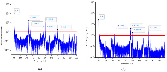 Figure 11 shows that the 0 Hz component was the fundamental motion without oscillation. The frequency component of 50 Hz did not change with the load; thus, it was noise.
