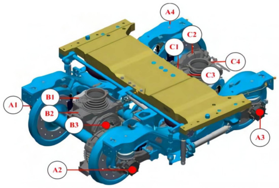 This paper aimed to analyze the running gears model and establish a data-driven FD model. The running gears system has such a multi-level complex structure. Therefore, it is difficult to build an FD model. As shown in Figure 1, many temperature sensors are arranged inside the gears. The test points of temperature sensors, for example, – for axle box bearing temperature measuring point, – for motor temperature measuring point, and – for gear box temperature are shown in Figure 1 [31].