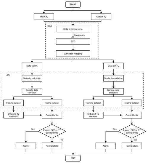 In order to solve the above problems, this paper proposed an FD method based on CCA and JITL. We mainly used the CCA component to preprocess and normalize data, transform high-dimensional data into low-dimensional variable covariance subspaces and maximize the correlation between the most important top latent dimensions. SVD was applied to decompose the covariance matrix of input and output into two separate singular subspaces and keep the original distribution trends of variable correlations. Subspace mapping procedures projects input and output matrices back to the singular subspaces only with the most important relations and generates two groups of variables, Px and Py, after dimension reduction which eliminates the noise, that is, the residual subspaces. Then, JITL was used to calculate the Euclidean similarity of the query sample and the training data, respectively, and selected a sample subset for online testing regarding distances between them. During the experiments, the data sets of Px and Py were equally divided as a training data set and a testing data set. Finally, the FD model formulated statistics to define thresholds of fault signals and performed to detect signal faults in the testing samples. The workflows of the model are shown in Figure 2.