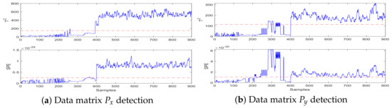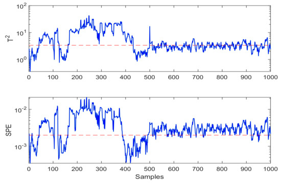 In the FD algorithm, statistics and their corresponding thresholds define the boundaries of system prediction. and SPE are the two most commonly used statistics in FD [33,34,35,36]. Taking the two data matrices and perform separately FD. The detection of the subspaces is the same as the routine detection process. Then, judging whether the input signals normally or not requires the following methods [4]