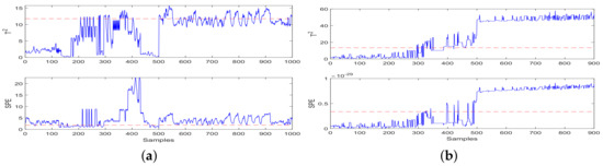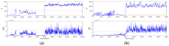 Based on the detection results shown in Figure 4, the detection of data set after injection fault data is normal, and the detection results of data set show short-term and transient fluctuations after fault injection. Then, the statistics fall back above the threshold. The detection results of the datasets and are compared with each other to verify the performance after injecting fault data, Figure 4a detects a fault, and Figure 4b shows short-term fluctuations. Then, the statistics fall back above the threshold. According to the comparison and verification of the FD results, it was proved that the fault detection at the 500th sample was accurate. Based on the detection results shown in Figure 5, it was observed that statistics were above the threshold before the injection failure time, so false positives have occurred. Moreover, after the injection fault, there is a fluctuation of the statistical value lower than the threshold value, and there is a situation of false negatives. Based on the detection results shown in Figure 6, in Figure 6a it was observed that statistics were above the threshold before the injection failure time, so false positives have occurred. Additionally, after the injection fault, there is a fluctuation of the statistical value lower than the threshold value, and there is a situation of false negatives. Based on the detection results shown in Figure 6b, detection after fault injection is normal, but the fluctuation of statistical value before injecting fault data was partly above the threshold, so a false positive situation had occurred.