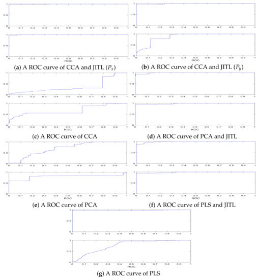 The ROC curves of FD models. (a) A ROC curve of CCA and JITL (); (b) A ROC curve of CCA and JITL (); (c) A ROC curve of CCA; (d) A ROC curve of PCA and JITL; (e) A ROC curve of PCA; (f) A ROC curve of PLS and JITL; (g) A ROC curve of PLS.