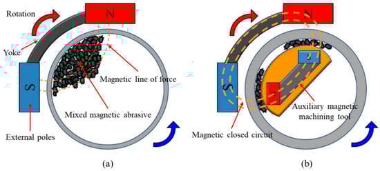 (a) Machining principle of traditional magnetic abrasive finishing process for the thin-walled tube workpiece; (b) machining principle of magnetic abrasive finishing process with an auxiliary magnetic machining tool for the tube workpiece.