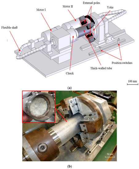 The three-dimensional diagram of the equipment and the external view of the experimental setup are, respectively, shown in Figure 2a,b. There are two motors in this equipment. Motor I drives the chuck to perform a rotational movement through coupling with a flexible shaft. The tube workpiece is fixed by the three-jaw chuck to perform a synchronous rotational movement. The rotational units of the magnetic poles are composed of four ferrite magnets (50 × 35 × 26 mm) and located on the outside of the tube workpiece. They are arranged in the type of “N-S-S-N” and fixed on the yoke. In this way, two pairs of “N-S” closed magnetic field circuit form around the “tube wall” of the workpieces. Motor II controls the rotational direction and speed of the external magnetic poles. The rotating device of the magnetic poles reciprocates along the axis of the tube workpiece through a pair of position switches. The mixed magnetic abrasive injected into the tube follows with the movement of the external magnetic poles to create friction on the internal surface of the tube workpiece. Hence, the internal surface finishing of the tube workpiece can be achieved. Since the mixed magnetic abrasive presents a slurry, a foam is used to plug one end of the workpiece to prevent the mixed magnetic abrasive from leaking.