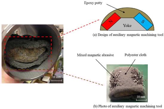 Based on the above-mentioned experimental setup, an auxiliary magnetic machining tool was designed and stuffed into the tube workpiece. The strength of the magnetic field can be improved in a closed magnetic field circuit. Figure 3a,b show the design and external view of the auxiliary magnetic machining tool. The auxiliary magnetic machining tool is composed of a pair of N-S permanent magnets, which are two Nd-Fe-B 380/80 (the minimum of coercivity was approximately 677 kA/m) permanent magnets with the measurements of 24 × 24 × 12 mm. The two Nd-Fe-B permanent magnets stick to a magnetic material yoke (SS400). The auxiliary magnetic machining tool looks similar to a stone with the magnetism from the outward appearance; thus, it is called a “magnetic stone”. Additionally, in order to prevent the edge of the auxiliary magnetic machining tool from directly hitting the internal surface of the tube workpiece, the magnetic stone was evenly wrapped with a thin layer of non-woven fabric (WA#3000). The non-woven fabric is not only used for polishing, but it also retains the mixed magnetic abrasive particles to adsorb on the surface of the magnetic machining tool.