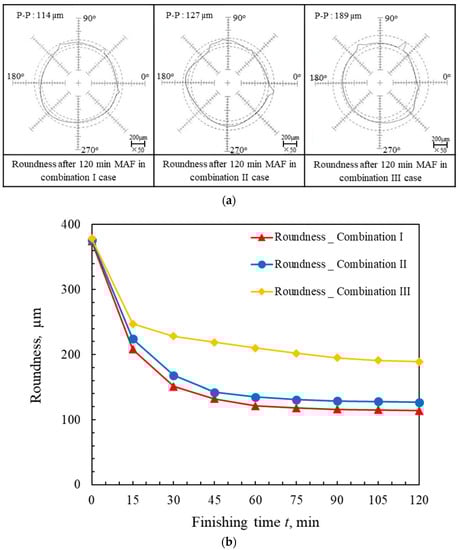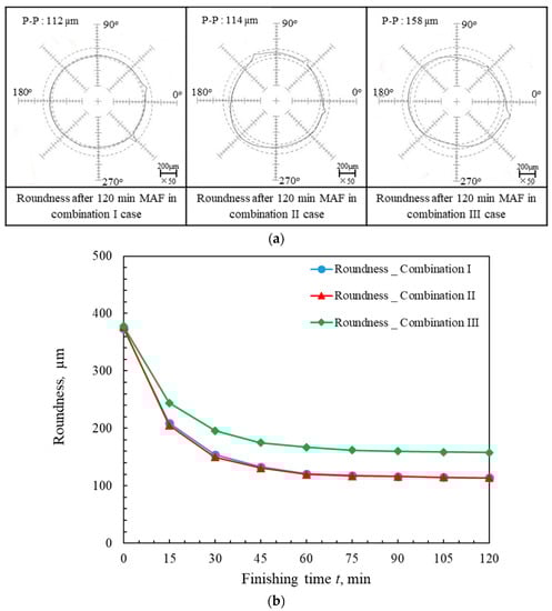 The change in roundness of the internal surface in the three different combinations of workpiece and external pole revolutions after 120 min of the MAF process are described in Figure 6. From the experimental results, as shown in Figure 6b, it can be observed that the roundness in the condition of combination I is better than that in the other two combinations (II and III). The profile morphology of the roundness after 120 min of the MAF process is optimal in the condition of combination I, as can be observed in Figure 6a. This is because the auxiliary magnetic machining tool produces a high centrifugal force with a high-speed rotation of external poles. The best roundness for the internal surface can be obtained at a high rotation speed of the external poles.