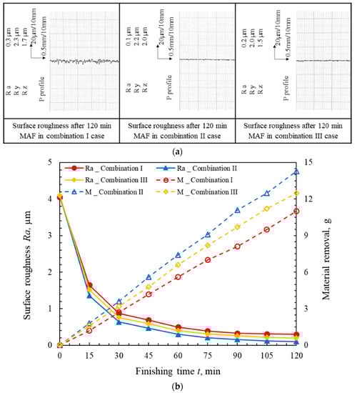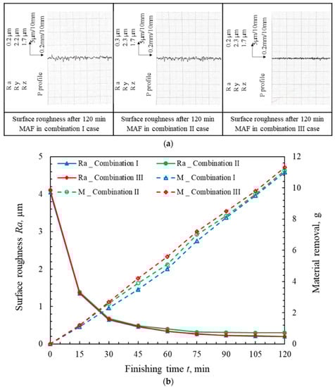 The change in surface roughness Ra and material removal M in the three different combinations of the mixed magnetic abrasive are shown in Figure 5. From the experimental results, as shown in Figure 5b, it can be observed that the surface roughness Ra in the conditions of combinations I and III are similar, and that they are better than the surface roughness Ra of the internal surface in the condition of combination II. The material removal increased with the increase in the amount of mixed magnetic abrasive. In addition, it was also found that the rate of change in surface roughness Ra of the internal surface was significantly slowed down after 60 min of finishing. The profile morphologies of the internal surface in different combinations after 120 min of the MAF process are shown in Figure 5a. The profile morphology of the internal surface in the condition of combination I was the best. Therefore, the optimal combination of the mixed magnetic abrasive was considered as 20 g of 1680 µm electrolytic iron powder and 20 mL of 7.5 wt% #400WA slurry for the surface roughness Ra. Since the size of the magnetic abrasive particles and the surface roughness reached a balance, the change in surface roughness Ra was not obvious after 60 min of finishing.