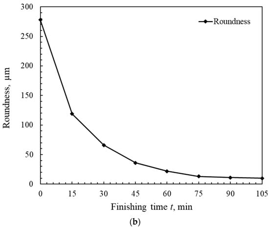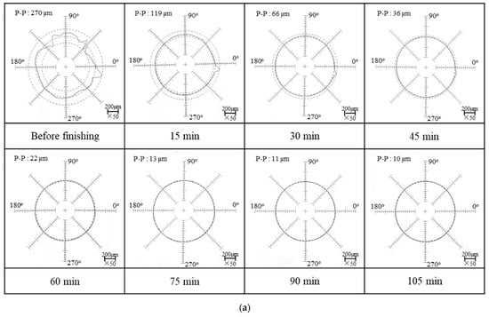 Based on the influence of the size of the magnetic abrasive particles on the surface roughness, the multi-stage MAF process was performed by continuously adjusting the size of the magnetic abrasive particles. The profile morphologies and change in roundness of the internal surface after each finishing stage are respectively shown in Figure 8a,b. Compared with the above-mentioned two experimental results, it was found that the roundness of the internal surface was significantly improved at a high-speed rotation, and the roundness reached 66 µm after the first two finishing stages (30 min). This was because a larger centripetal force was generated in the case of the high-speed rotation. On the other hand, the roundness of the internal surface continued to be improved further by reducing the size of the abrasive particles from the third finishing stage (45 min). The roundness reached 22 µm by using 20 g of 330 µm electrolytic iron powder mixed with 20 mL of #1000WA slurry after the fourth finishing stage (60 min), and the roundness reached 11 µm by using 20 g of 75 µm electrolytic iron powder mixed with 20 mL of #4000WA slurry after the sixth finishing stage (90 min). Hence, it was considered that the used abrasive particle sizes matched the roundness in different finishing stages. Finally, the roundness reached 10 µm by using 20 g of 30 µm electrolytic iron powder mixed with 20 mL of 1~2 µm diamond particles after the last finishing stage (105 min). The change in the roundness almost reached the limit until the last finishing stages.