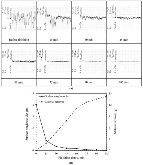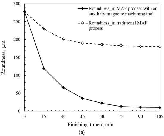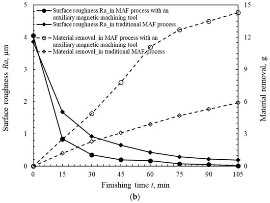 Finally, the comparisons of roundness and surface roughness in the traditional MAF process and MAF process with an auxiliary magnetic machining tool are shown in Figure 13. It can be observed that the roundness of the internal surface following the MAF process with an auxiliary magnetic machining tool is better than that after the traditional MAF process, as shown in Figure 13a. In addition, it can also be observed that the surface roughness Ra following the MAF process with an auxiliary magnetic machining tool is less than that following the traditional MAF process; the material removal in the MAF process with an auxiliary magnetic machining tool is 2.4 times greater than that in the traditional MAF process, as can be observed in Figure 13b.