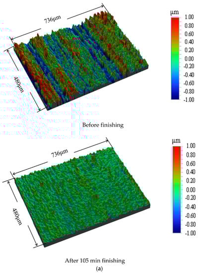 The non-contact 3D morphology of the unfinished and finished internal surfaces are shown in Figure 10a. The original morphology with a lot of initial texture lines can be clearly observed on the internal surface of the tube workpiece before finishing. Compared with the original morphology of internal surface, it was recognized that the protruding part of the original internal surface was almost removed after the MAF process. Although the individual points remain higher or lower after the MAF process, the morphology of the finished internal surface can be considered as uniform. Furthermore, from the physical photos of the internal surface before and after 105 min of finishing, as shown in Figure 10b, it was confirmed that not only can the weld bead be removed, but mirror-finishing can also be achieved by using the MAF process.