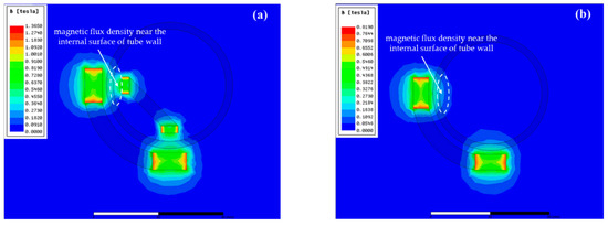Nephogram graph of magnetic flux density for the traditional MAF and MAF with additional magnetic tool. (a) Nephogram graph of the magnetic flux density for MAF with additional magnetic tool; (b) Nephogram graph of magnetic flux density for the traditional MAF.