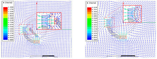 Distribution map of magnetic field lines for the traditional MAF and MAF with additional magnetic tool. (Left) Distribution map of magnetic field lines for MAF with additional magnetic tool; (Right) Distribution map of magnetic field lines for the traditional MAF.