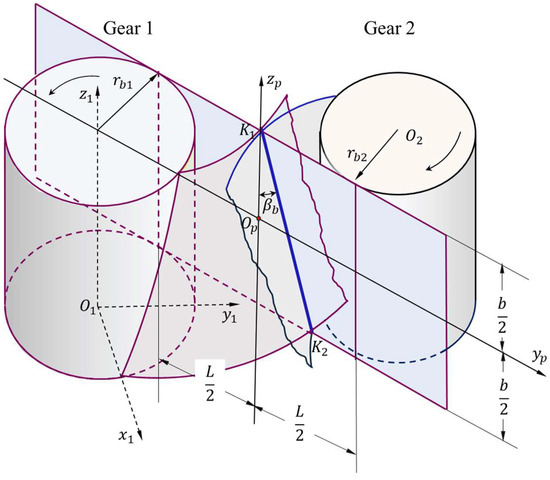 According to the principle of gear meshing, any point on the tooth flank can find a corresponding point on the meshing plane. The characteristic line on the tooth flank also has a corresponding mapping relationship on the meshing plane. The mapping process involves two coordinate systems, one is the gear coordinate system, and the other is the meshing plane coordinate system [13,14].