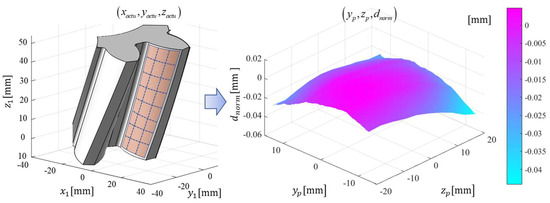 A mapping relationship is established between the gear 3-D coordinate system and the 2-D coordinate system of the meshing plane. This is a dimensionality reduction method, which facilitates and simplifies the visualization and evaluation of the 3-D deviation of the gear. Therefore, according to the actual point on the tooth flank, the normal deviation of the tooth flank at this point can be calculated. Then, the normal deviation can be transformed from the gear coordinate system to the gear meshing plane coordinate system, and the normal deviation map representing the entire tooth flank can be obtained. Figure 3 shows the actual point cloud in the gear coordinate system and its normal deviation map in the meshing plane coordinate system.