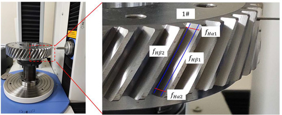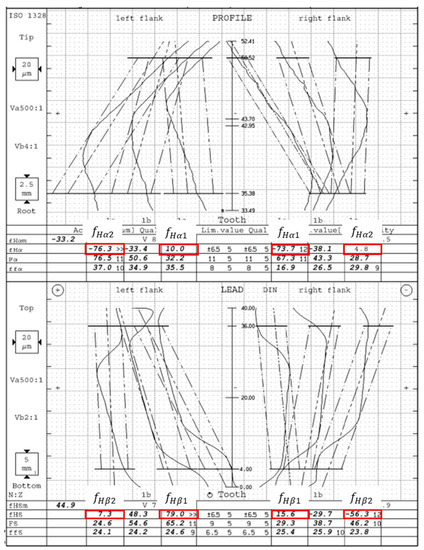 Figure 6 shows the measurement results of gear measuring center P26. The profile slope deviation and of 1# tooth are measured at the top and bottom of the tooth, and the helix slope deviation and are measured along the tooth tip and root. of the left tooth profile is −76.3 and is 10.0 . of the left tooth flank is 7.3 and is 79 . of the right tooth flank is −73.7 and is 4.8 . of the right tooth flank is 15.6 and is −56.3 . According to the evaluation method in ISO21771, the twist of the transverse profile of the left tooth flank is 86.3 and that of the right tooth flank is 78.5 . The twist of the flank line of the left tooth flank is 71.7 and that of the left tooth flank is 71.9 .