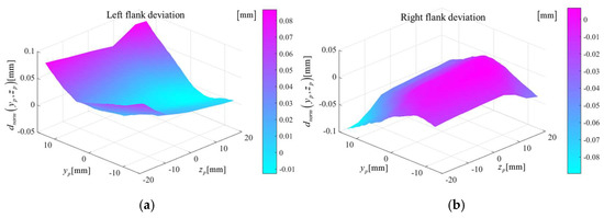 Topological deviation map of tooth flank. (a) Left flank deviation. (b) Right flank deviation.